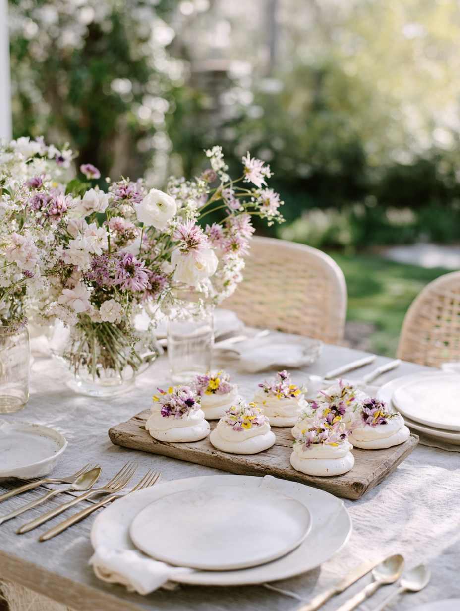 - A relaxed garden-inspired table layered with seasonal blooms and simple details